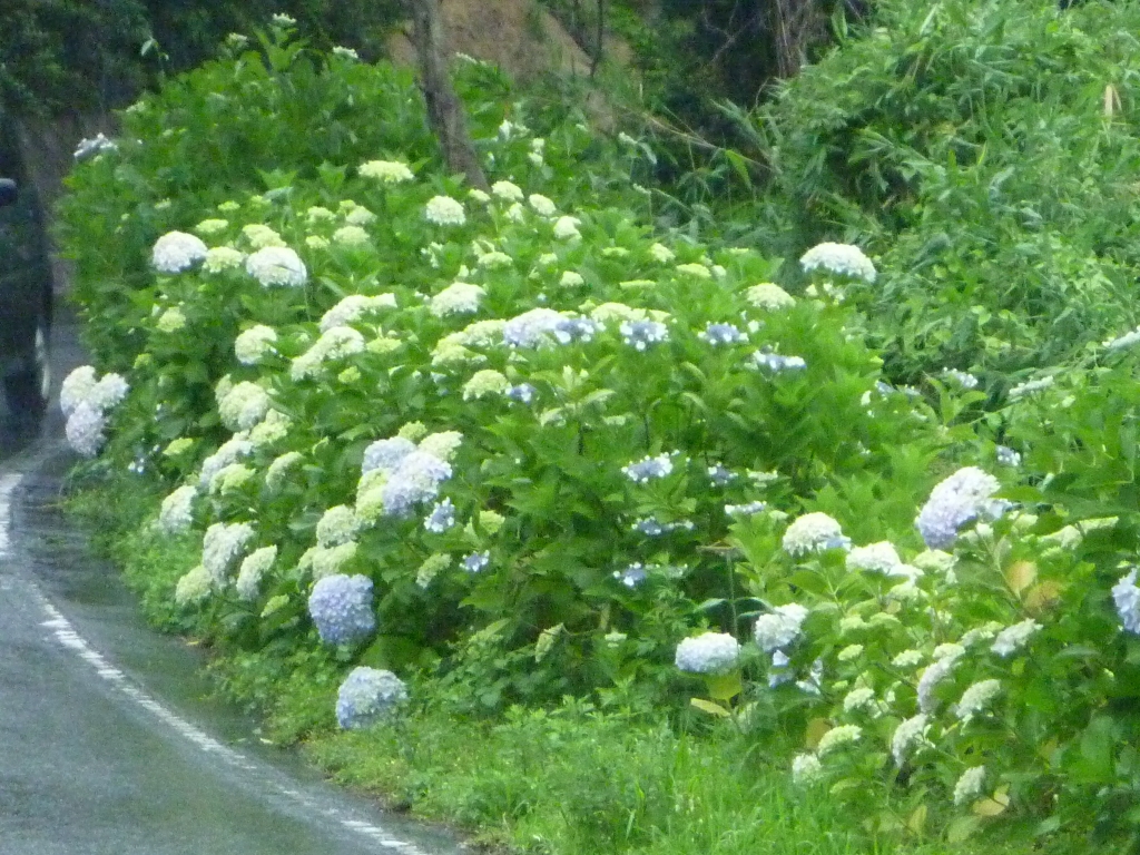 雨にぬれ路傍に咲くアジサイ(旧庵治町の町花)