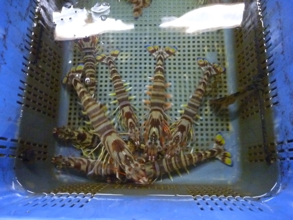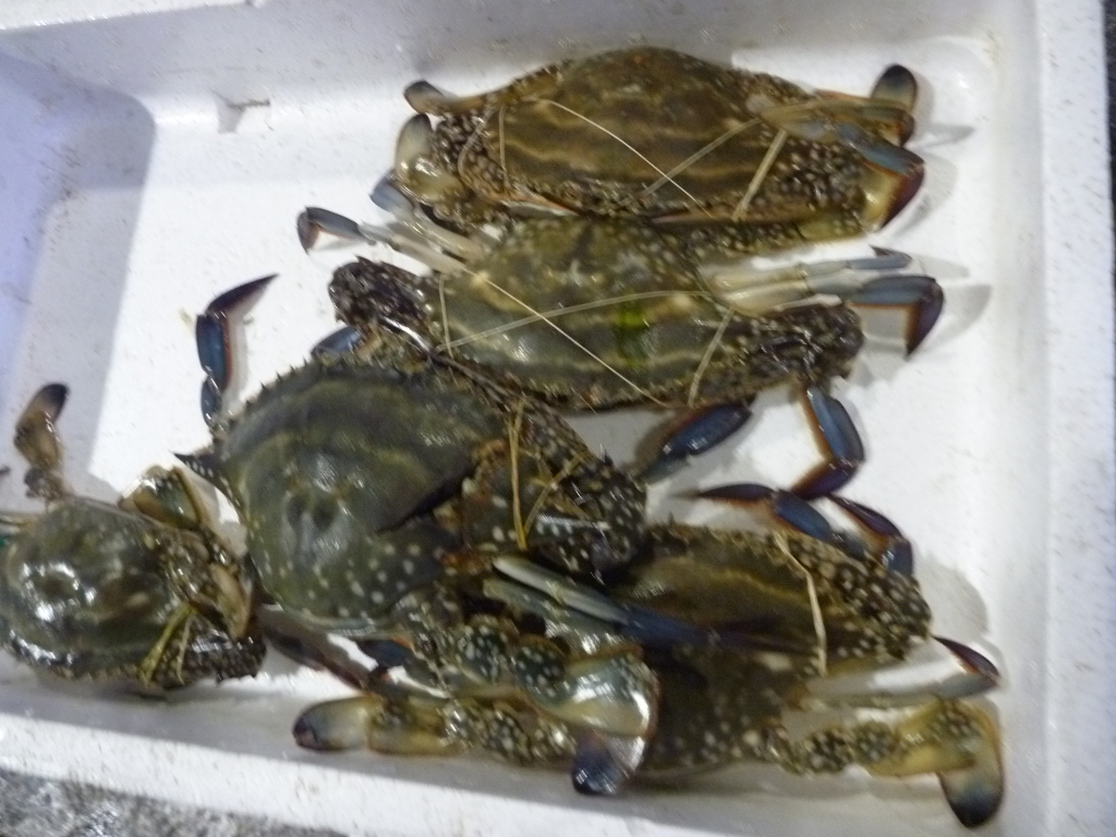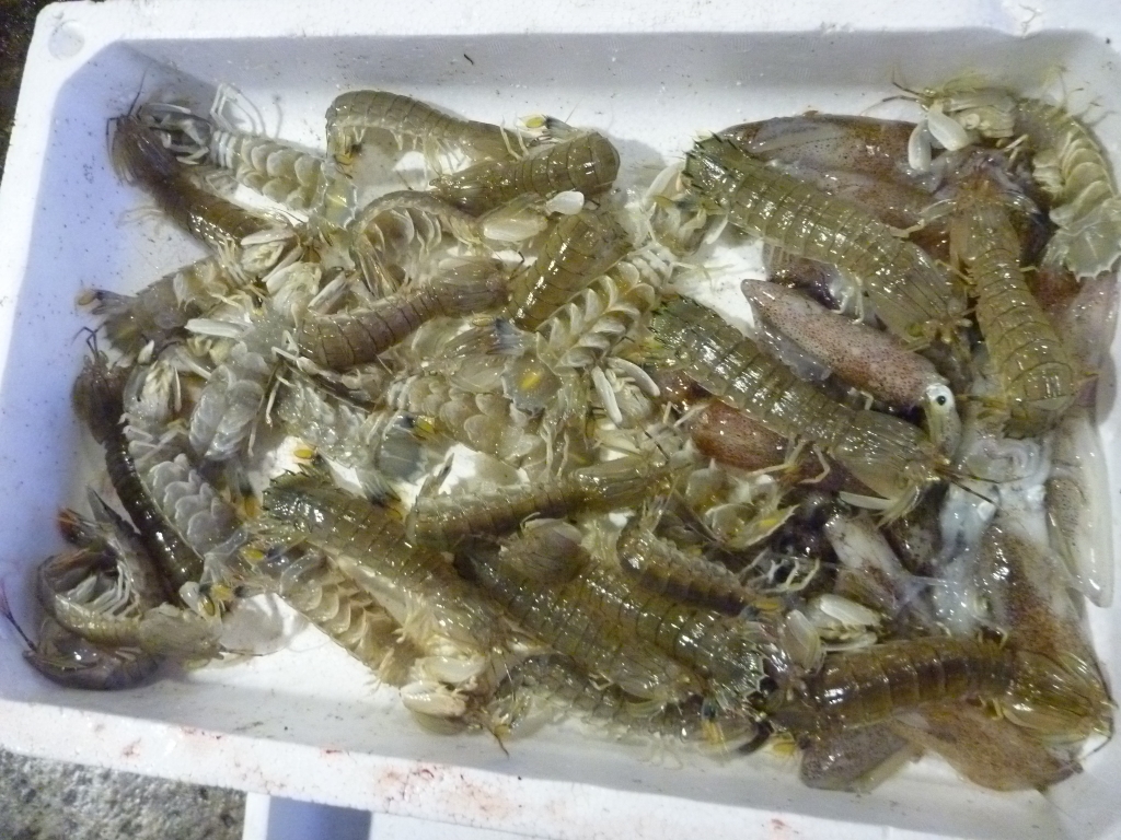 ワタリガニ、小エビ、クルマエビ、シャコ、ニシ貝等です。