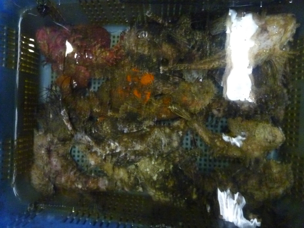 オコゼは、うろこがなく普通は、黑色ですが、黄色や赤褐色のものもいます。