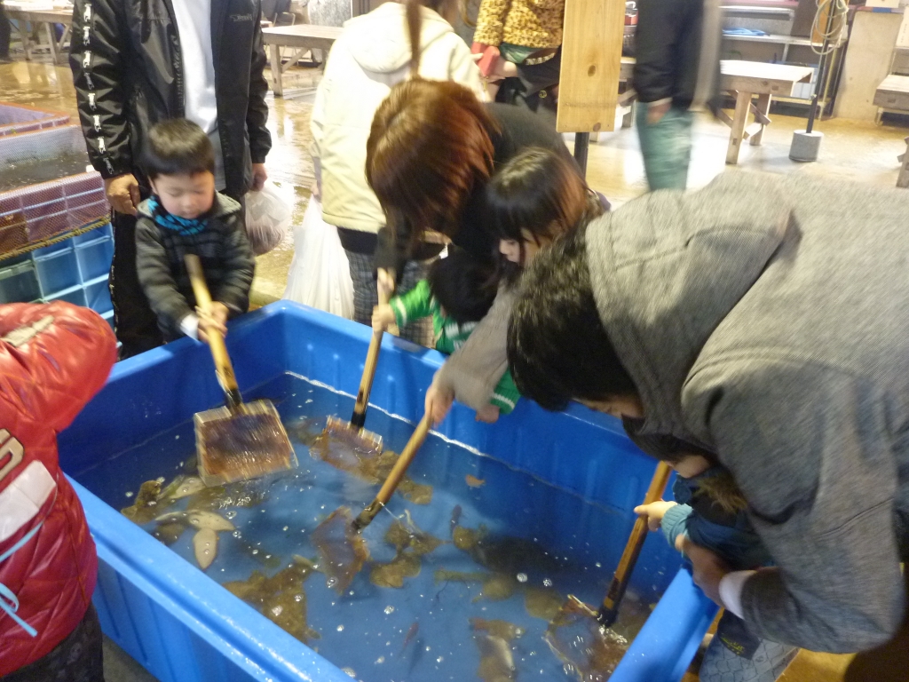 明日の日曜市は、定刻の午前8時に開市の予定です。 当番の漁業者は、午後3時には出漁しました。  ふれあいプールも実施できる見込みです。 各コーナー毎の主な販売品は、次の通りです。 活魚コーナー  メイタ、ヒラメ、イイダコ、小エビ等です。 鮮魚コーナー  ゲタ、キス、アナゴ、ベイカ等です。 女性部てんぷらコーナー  エビ・タコ・イカ・フグ等天ぷらです。 素潜りコーナー  ナマコ、サザエ、アワビ等です。 水産加工品コーナー  アナゴ白焼き、スルメイカ等です。 組合新商品コーナー  イイダコ・メイタ等の燻製です。 写真はイメージです。 | | | | |