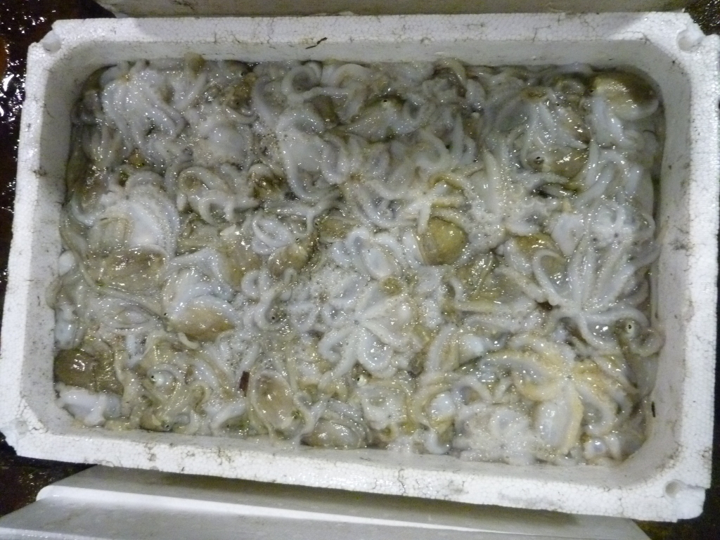 マダコ、イイダコ、小イカ、小エビ、モエビ、クルマエビ、ワタリガニ、