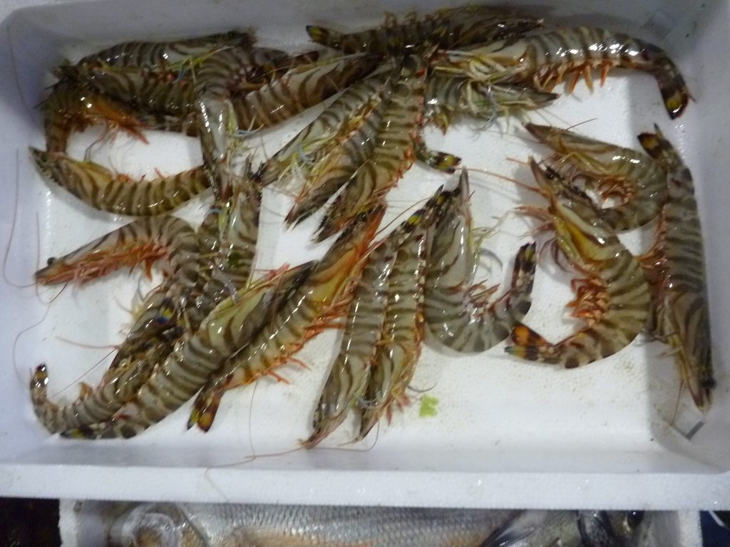 モエビは、クルマエビに似ていますが、色が黒っぽいので容易に区別がつきます。