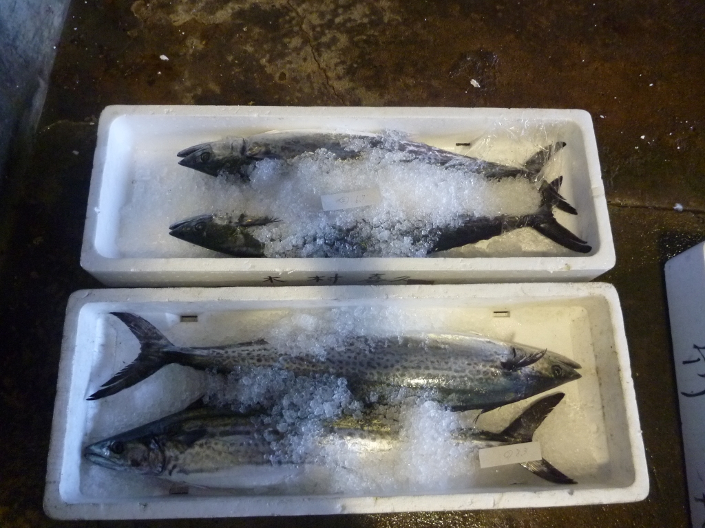 今朝のサワラの入荷量は、天候が悪かったせいか、前日よりは若干減少しています。
