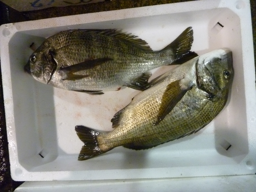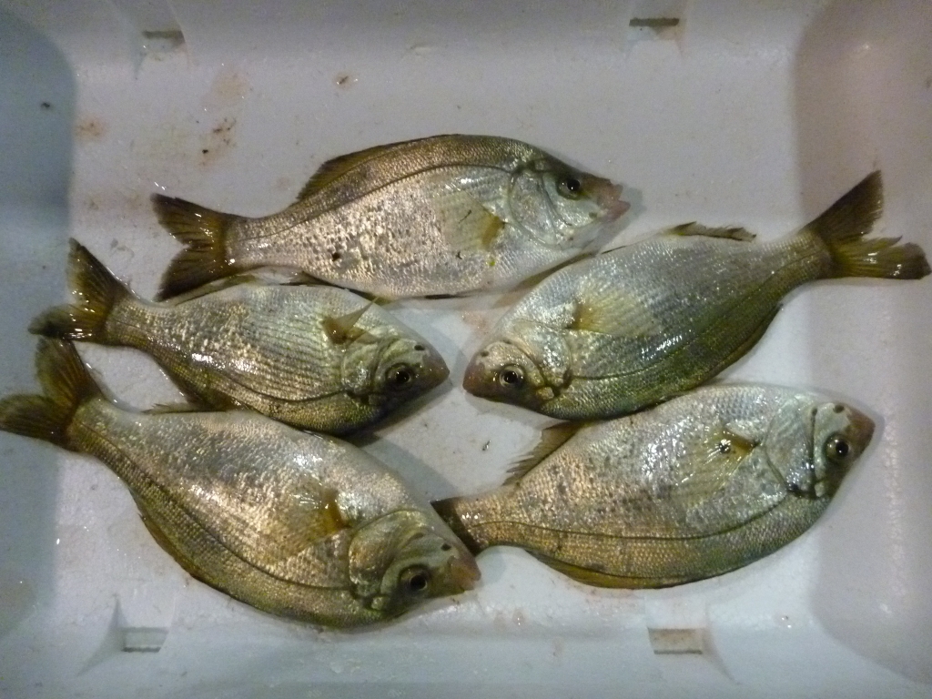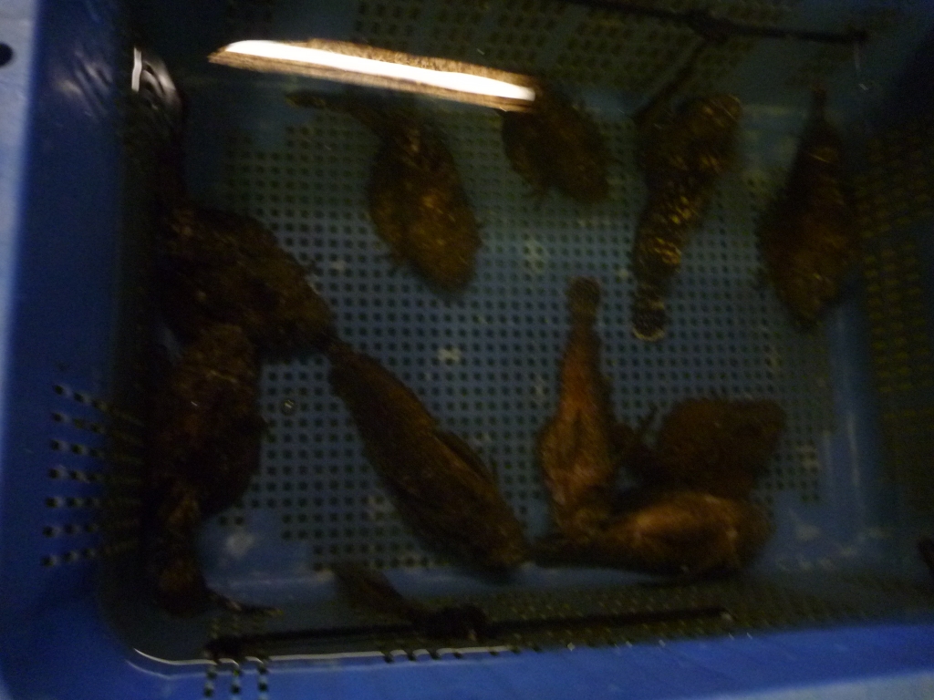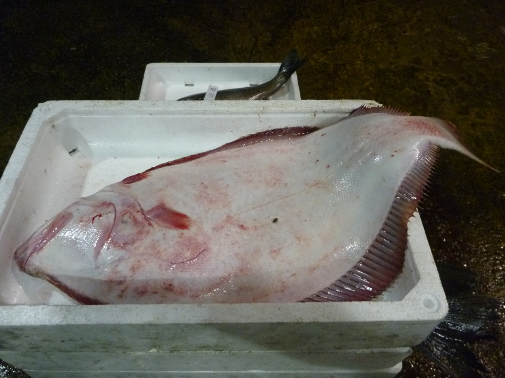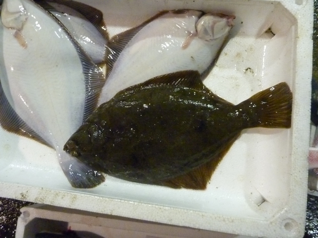 今朝の市場に枡網の漁獲物のマコガレイが見えます。