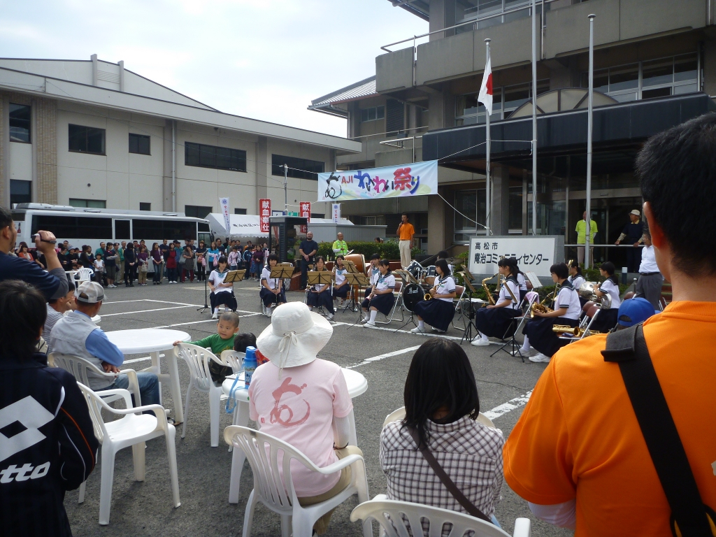 天候にも恵まれ、会長あいさつに続いて、庵治中学校のブラスバンド部の演奏があり、