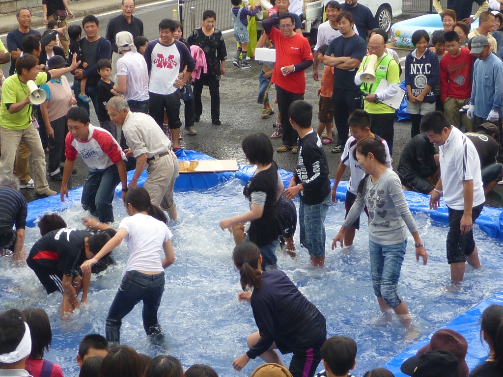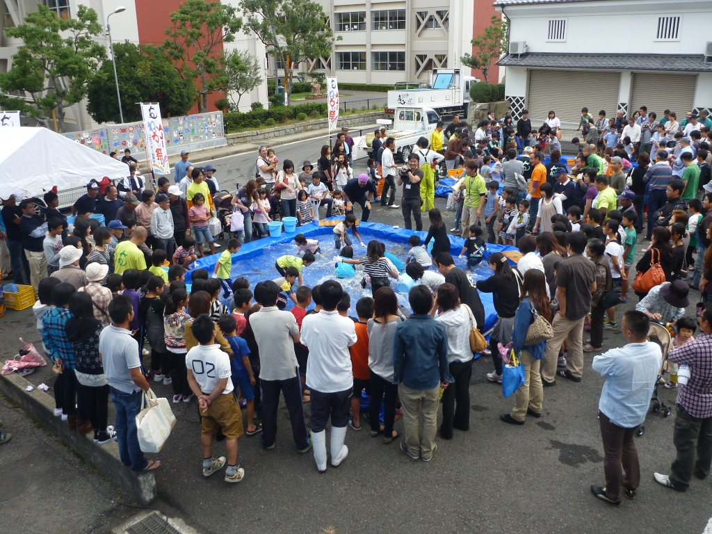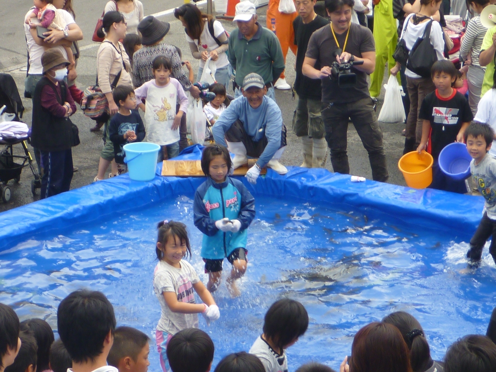 アジのつかみ取りでは、子供たちより周辺のギャラリのほうが力が入っていたようです。