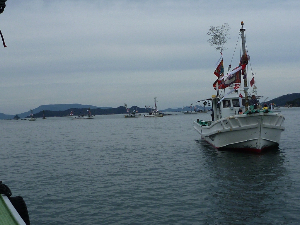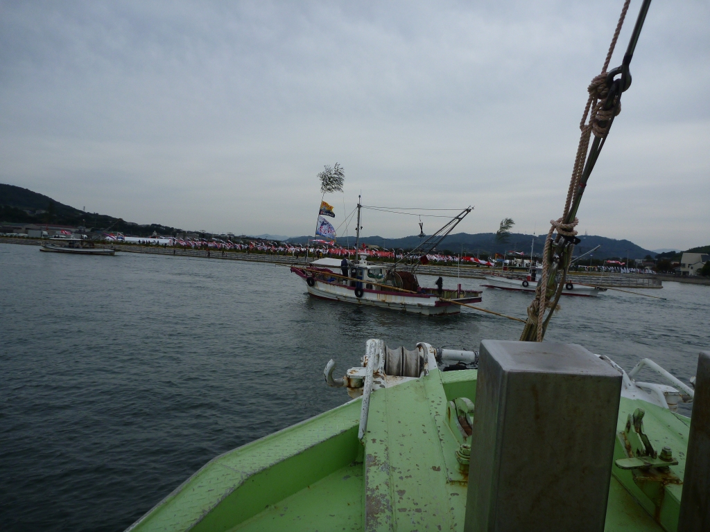 午後2時過ぎに各船が、笹竹や流旗、大漁旗等で飾り立て、水研屋島地先に集結しました。