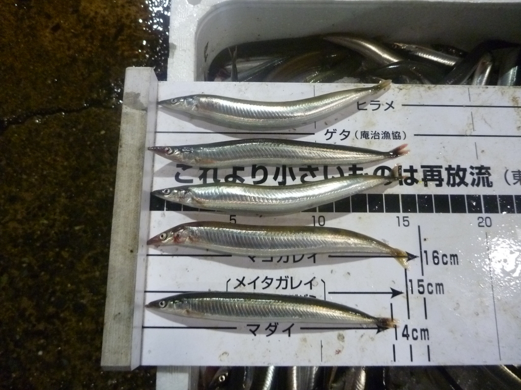 主なものは、マダイ、メバル類、メイタ、イカナゴ、ゲタ、ニベ、キス、ハネ、