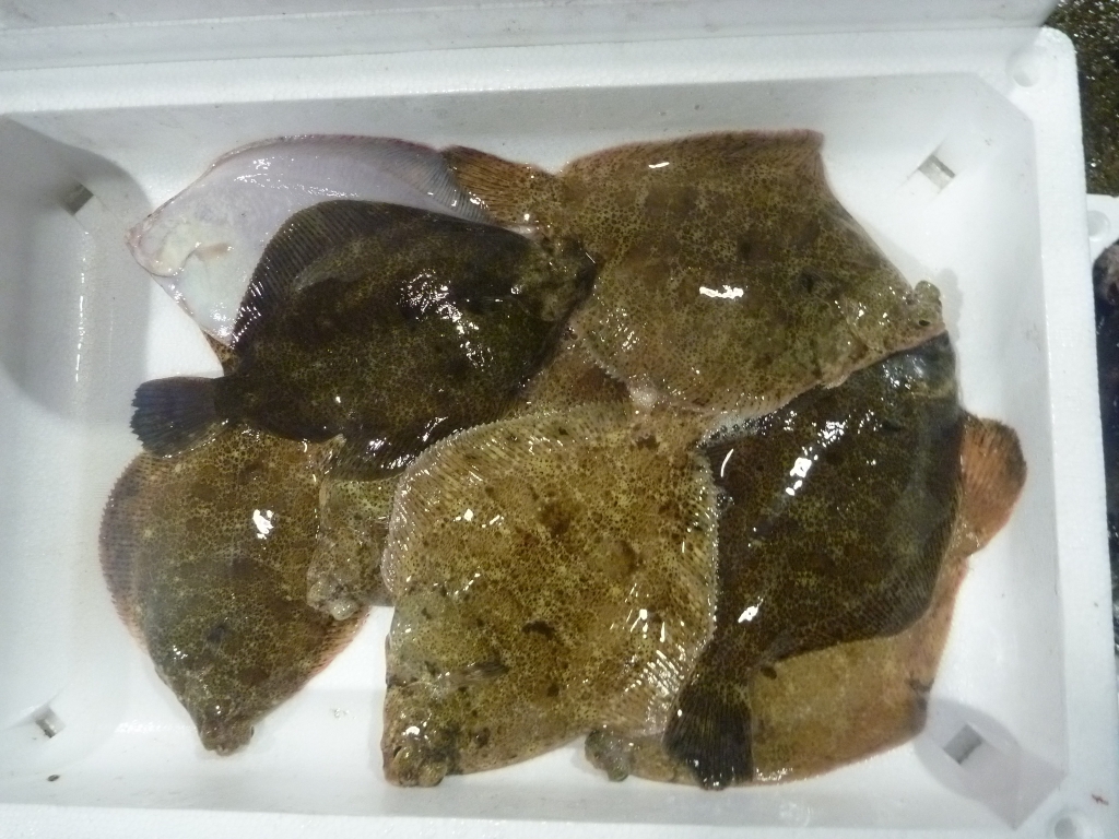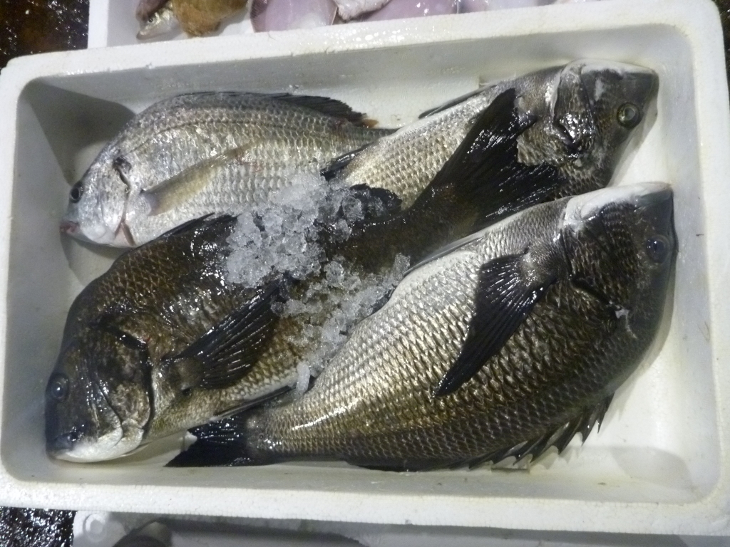 今朝の庵治市場に出ている主な魚は、マダイ、チヌ、ヒラメ、メイタ、