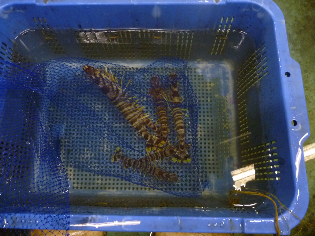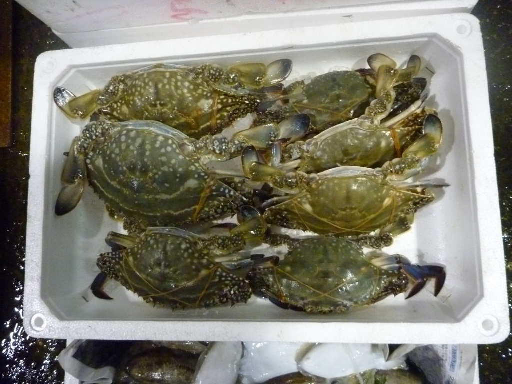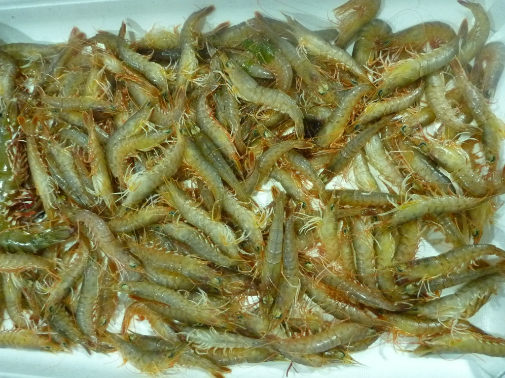 小エビ、クルマエビ、モエビ、ワタリガニ、ニシ貝等です。