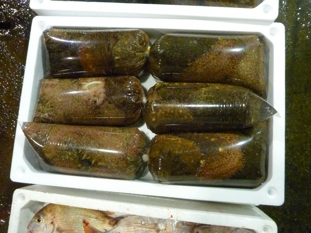 販売品(活魚・鮮魚・テンプラ・ナマコ・水産加工品・野菜等)以外に、明日は年末ということで