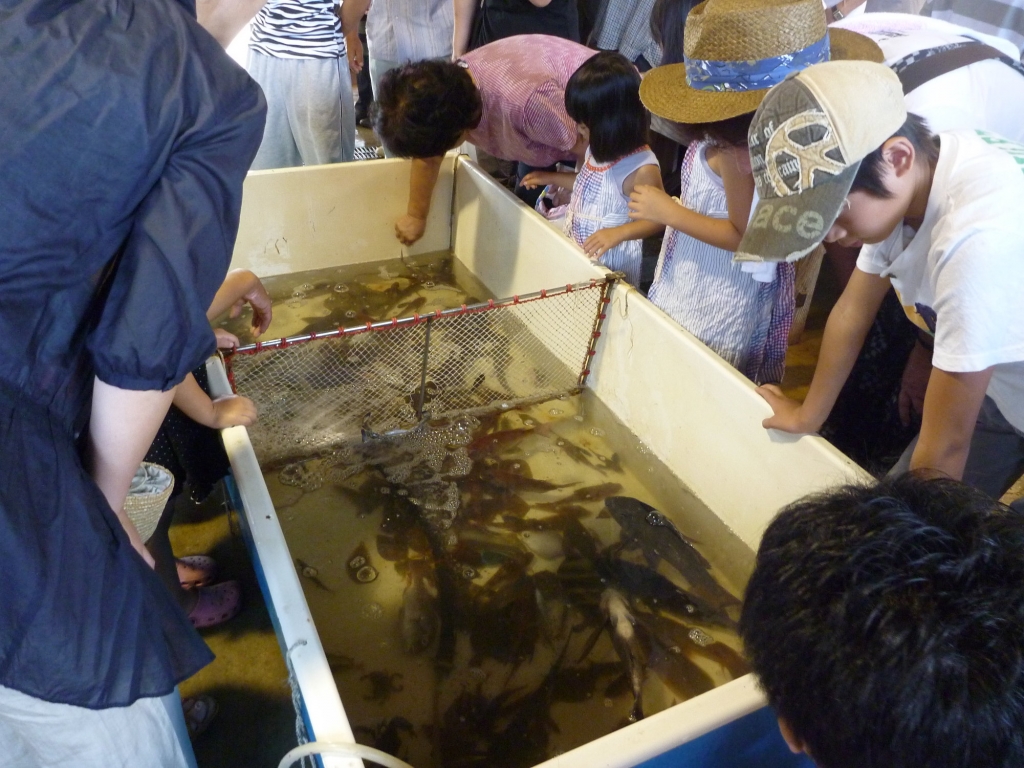 魚は、水槽に泳がしていますので、水槽の外からて手掴みしていただきます。