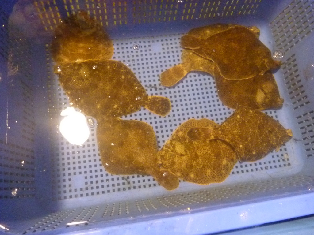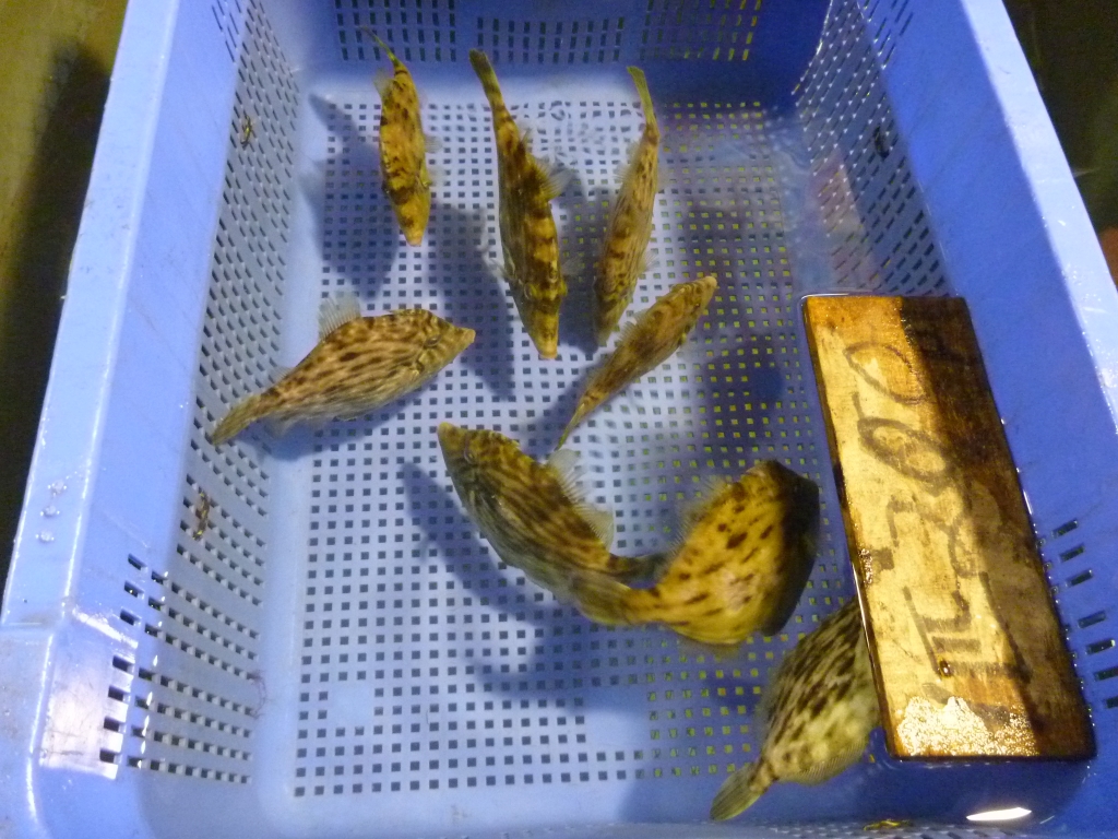 イイダコ、マダコ、メイタ、ヒラメ、マダイ、ハギ、小エビ等です。