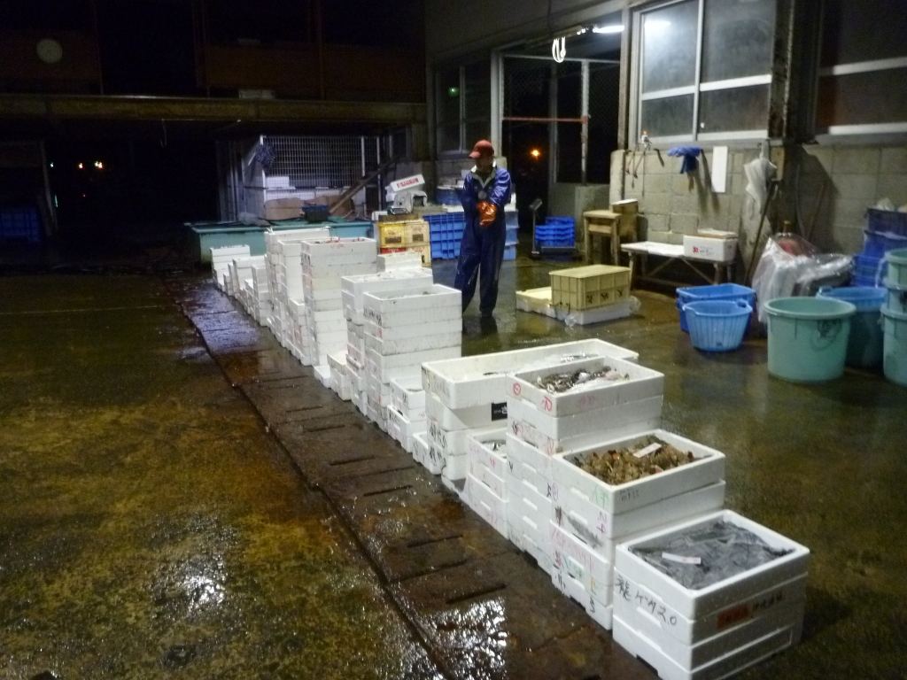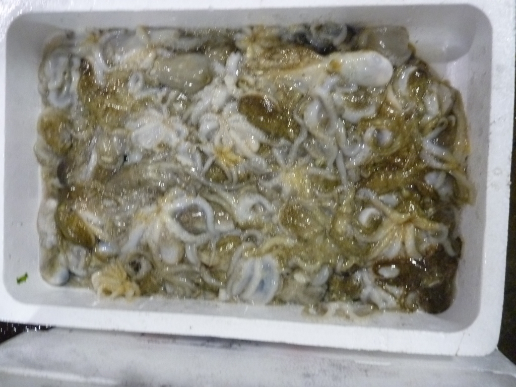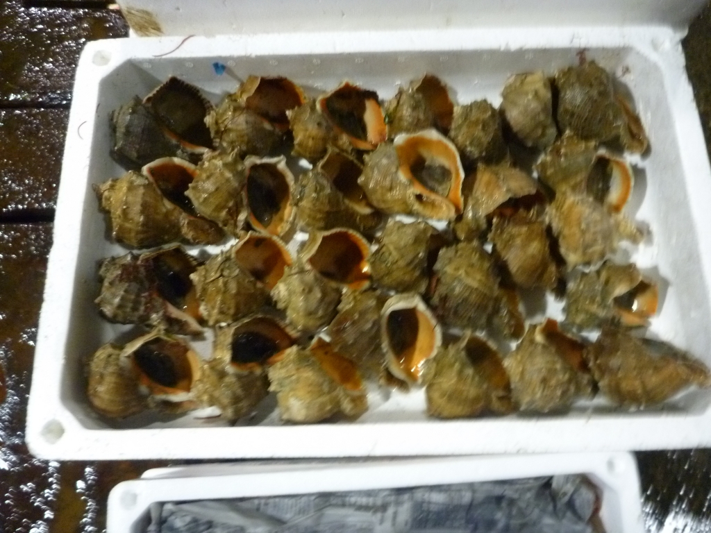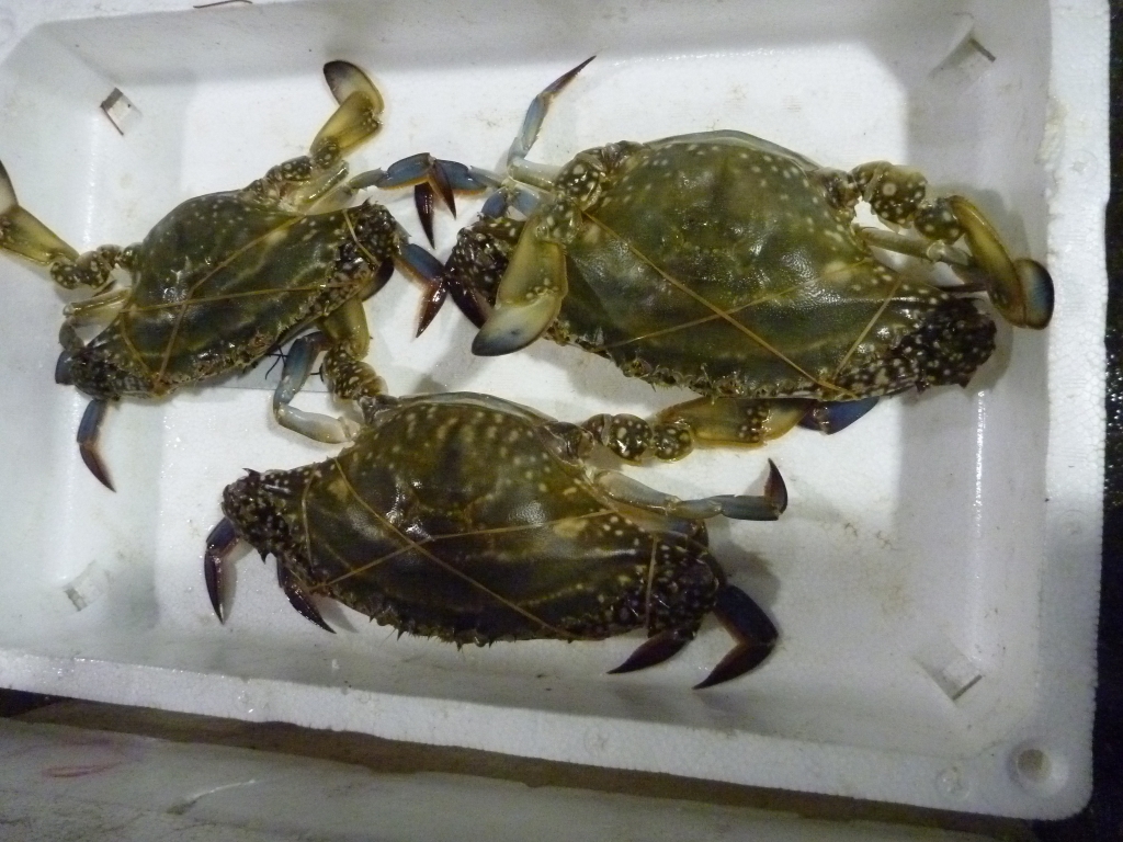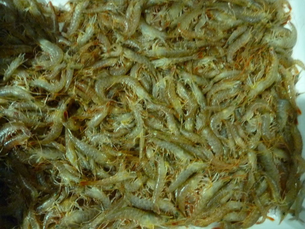 小エビ、クルマエビ、モエビ、ワタリガニ、ニシ貝等です。