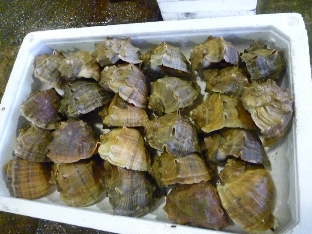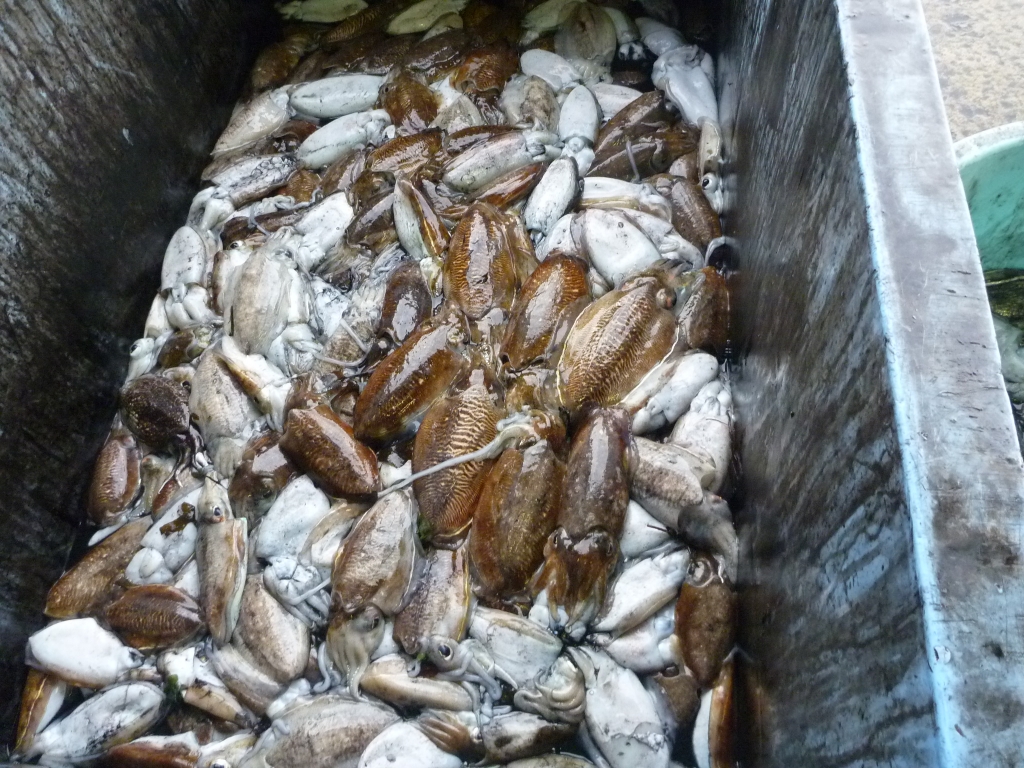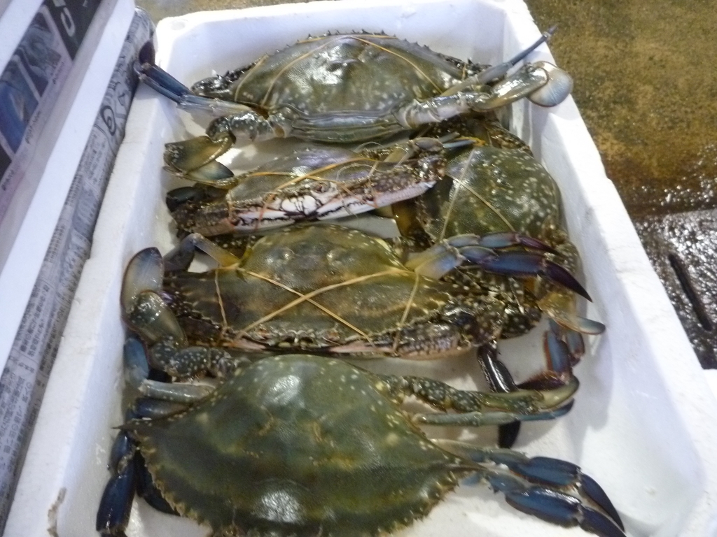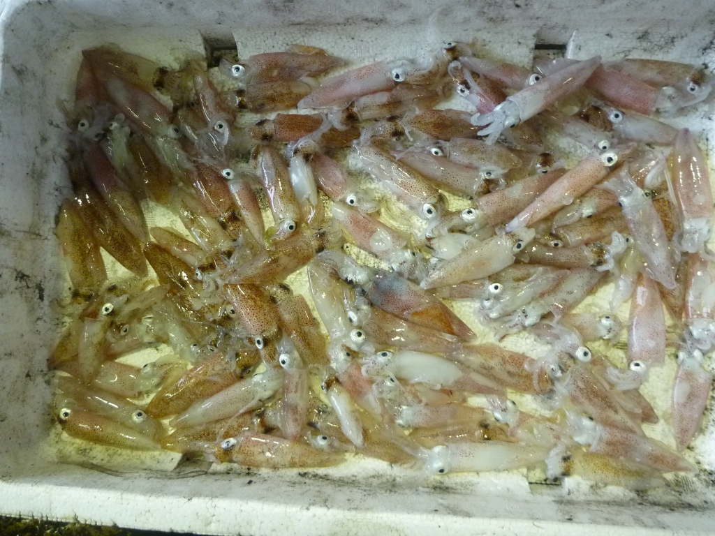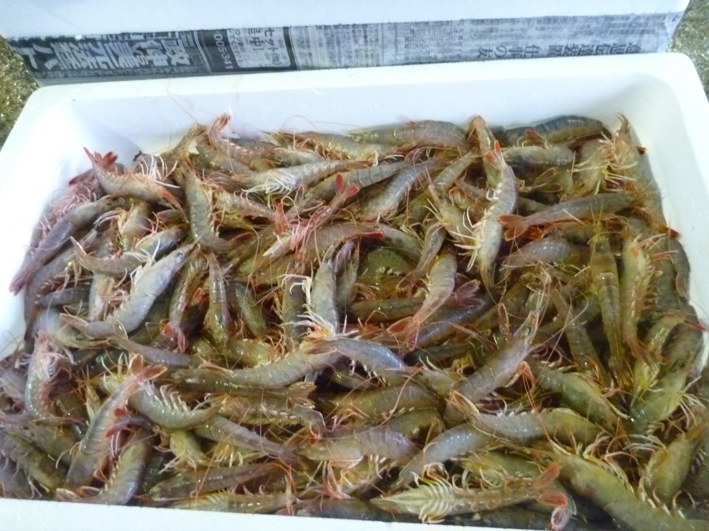 スルメイカ、小エビ、ワタリガニ、ニシ貝等です。