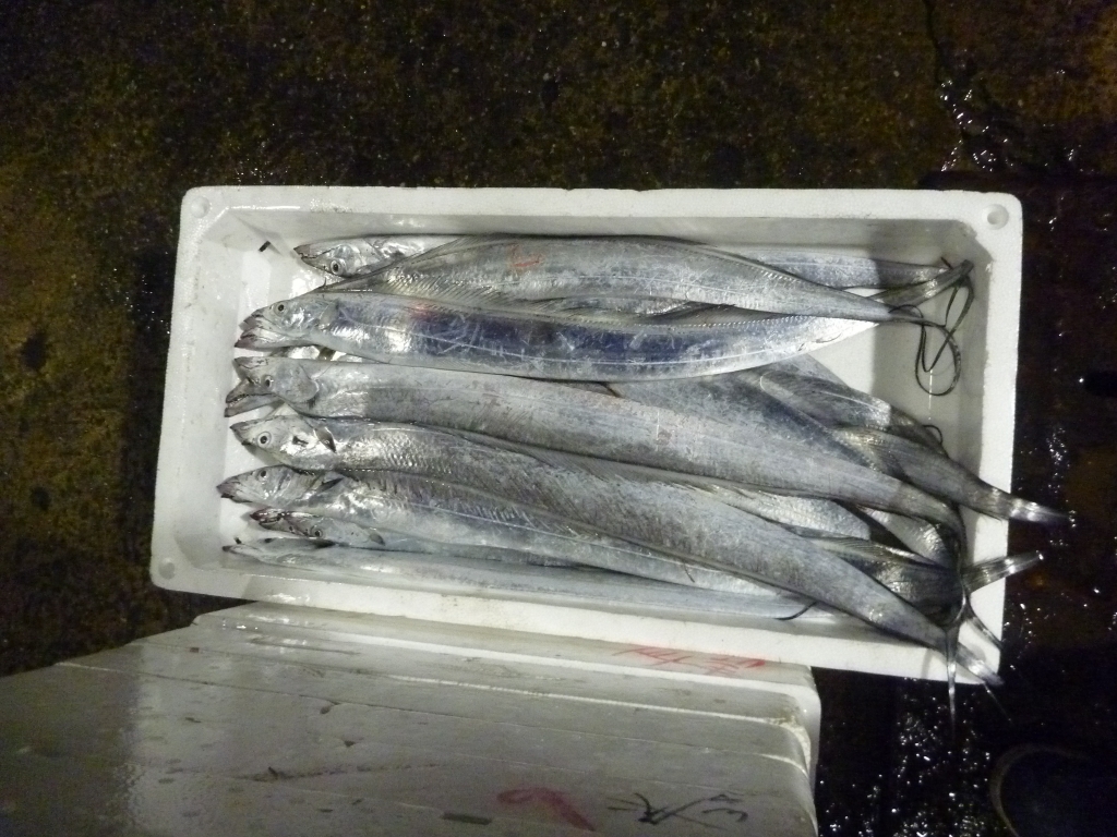 太いのから細いのまで、いろいろなサイズのタチウオが上がっています。