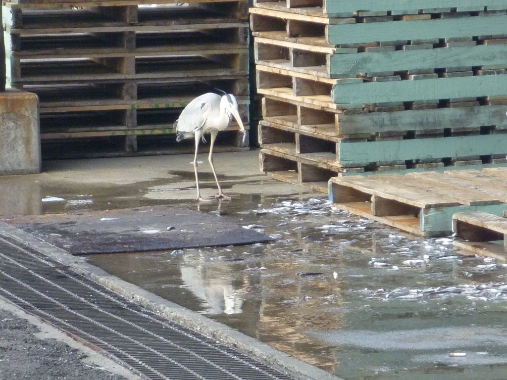 作業が終われば、荷揚げ場に侵入して、落ちている餌をあさります。