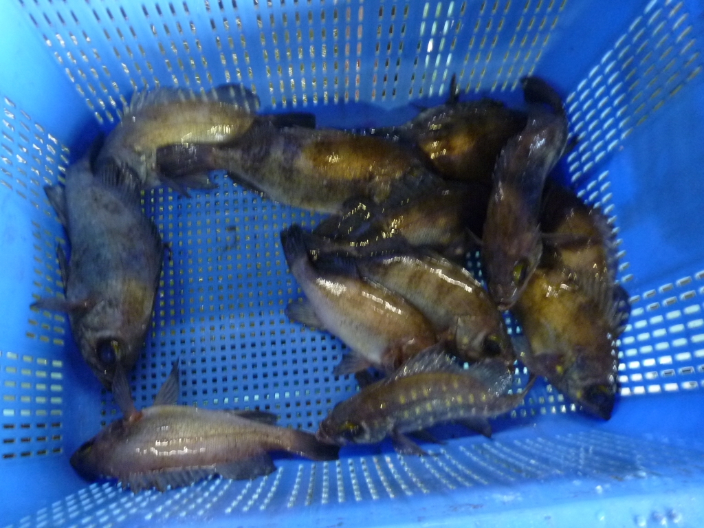 主なものは、マダイ、チヌ、メイタ、ゲタ、オコゼ、キス、ハネ、メバル類、コチゴ、トラフグ、