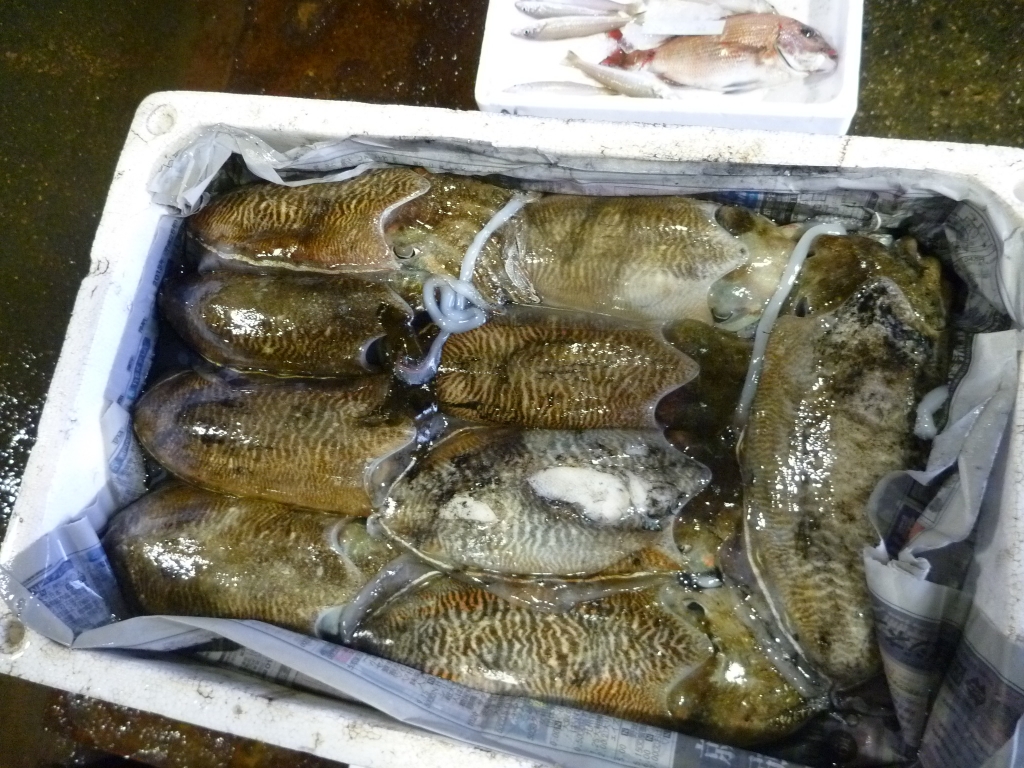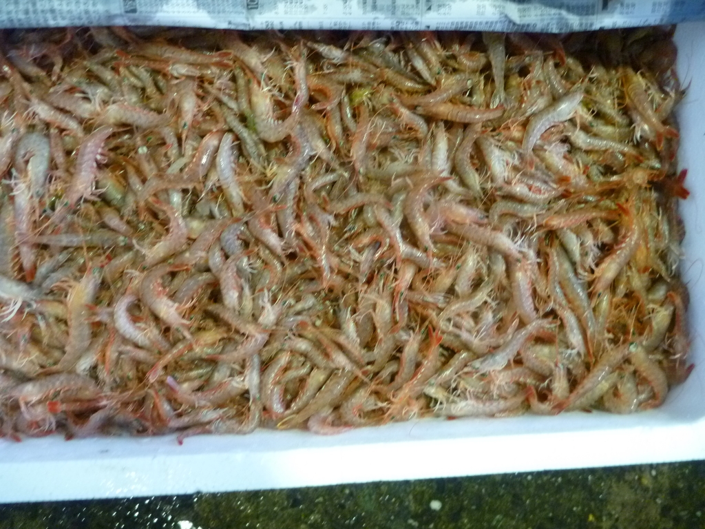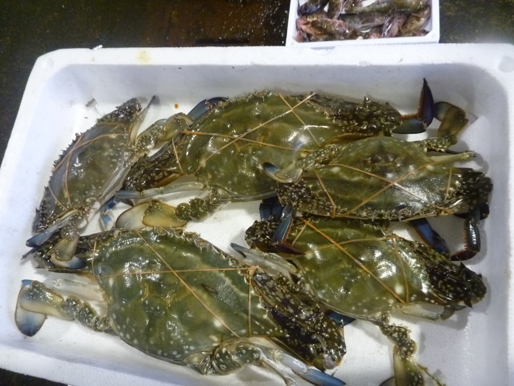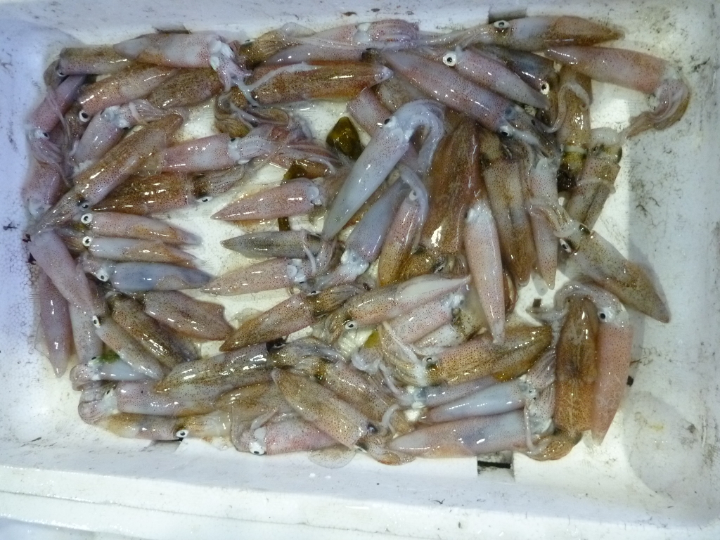 スルメイカ、小エビ、ワタリガニ、ニシ貝等です。