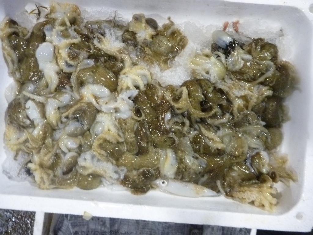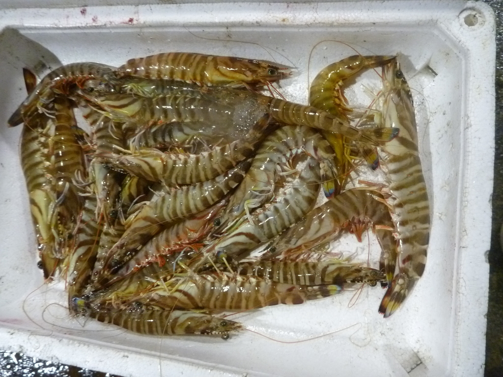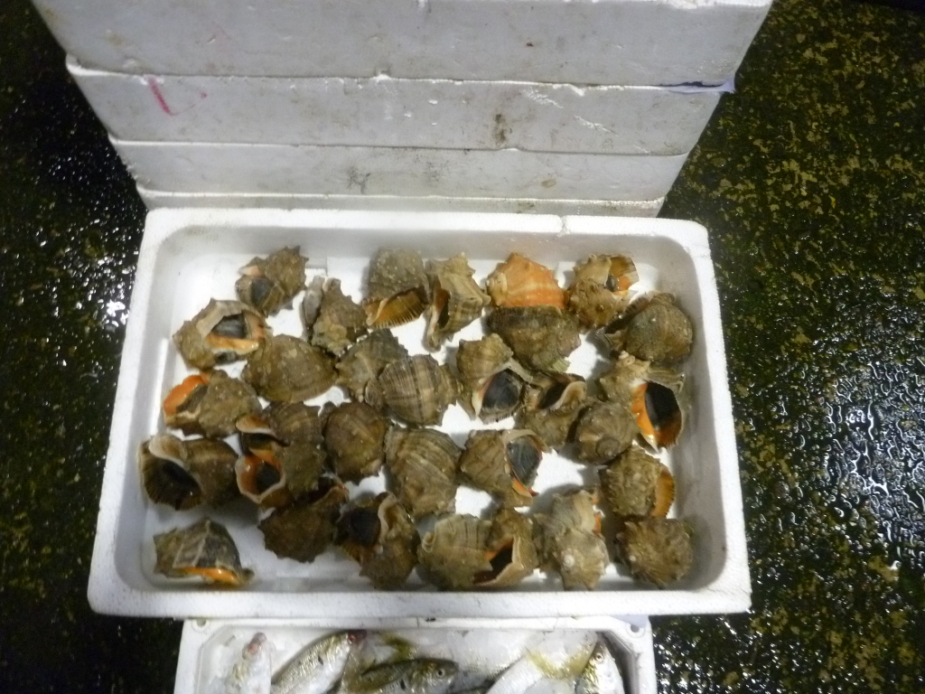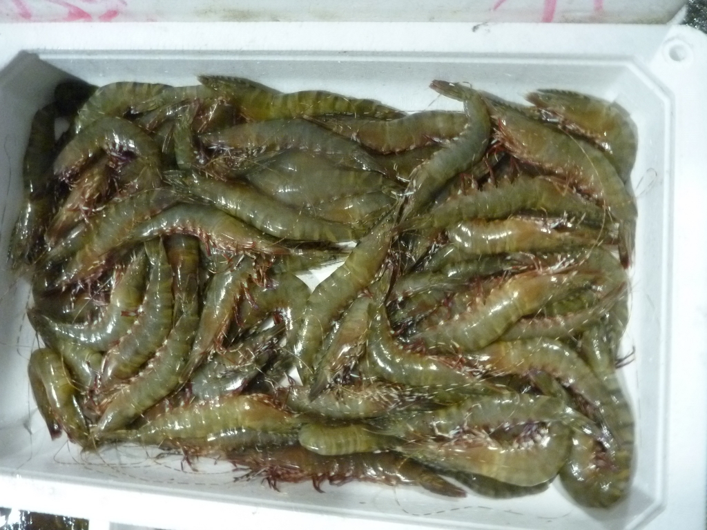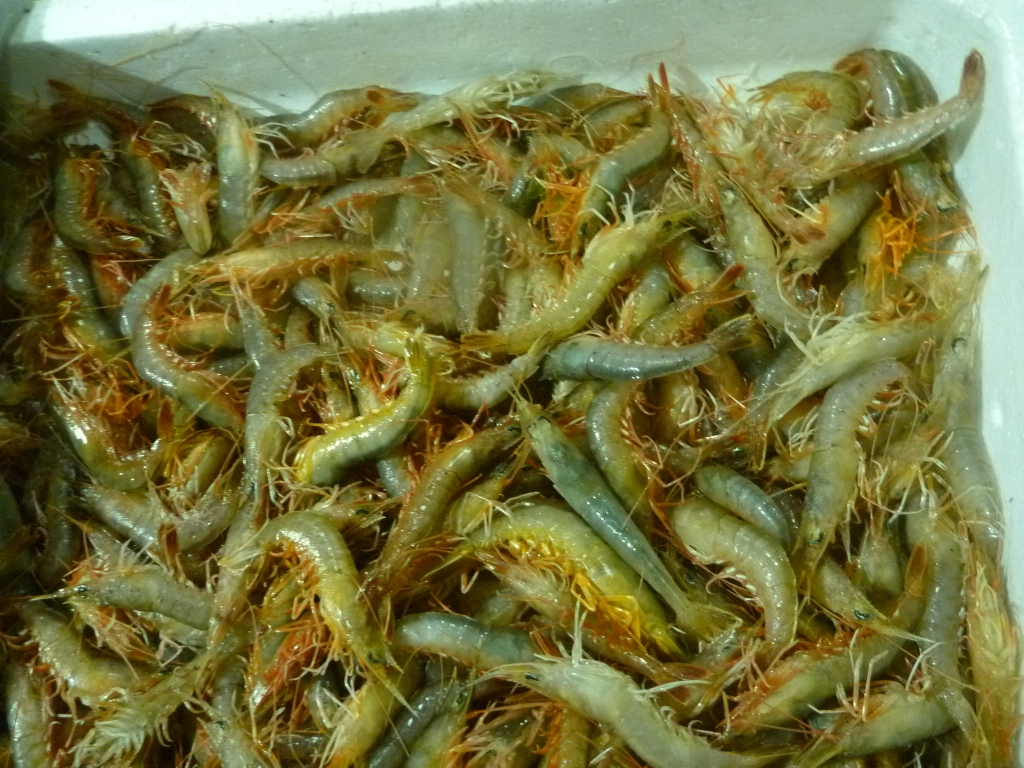 小エビ、クルマエビ、モエビ、ワタリガニ、ニシ貝等です。