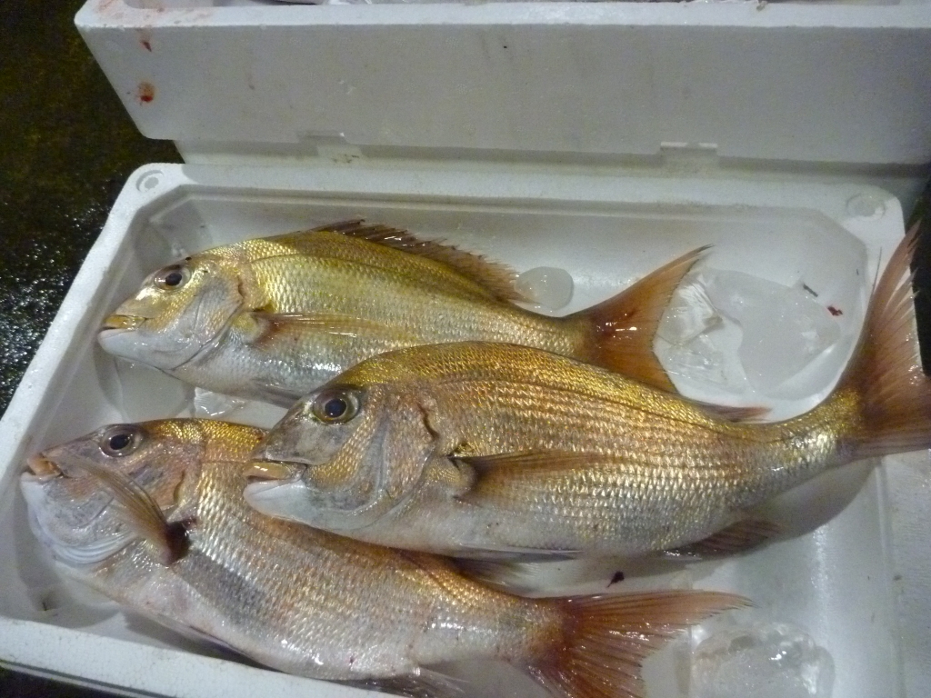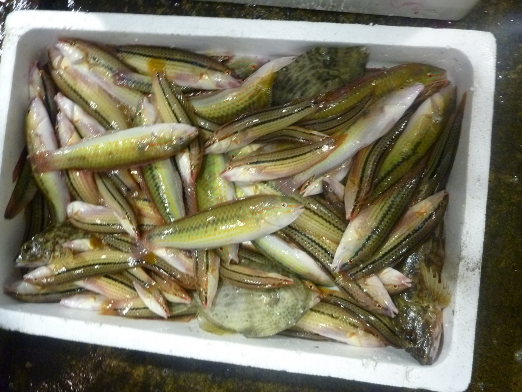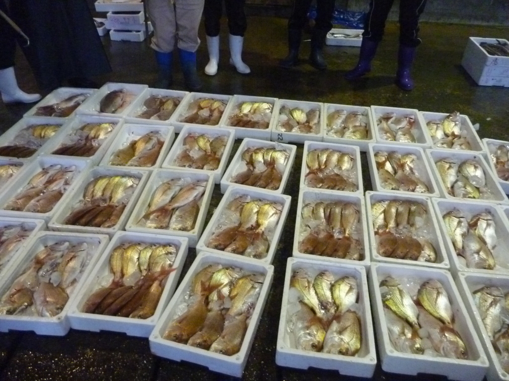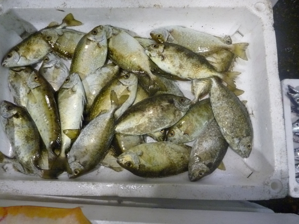 今朝の市場に出ている魚は、マダコ、マダイを中心に小エビ、ハネ、ゲタ、メイタ、小アジ、