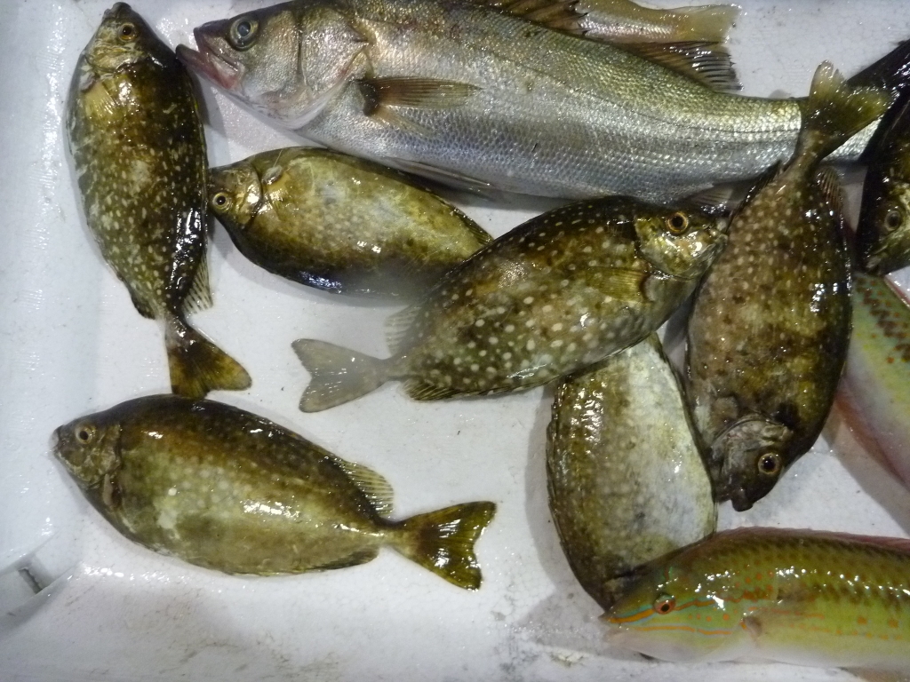 ハネ、ヒゲソリダイ、ヒラメ、シマゲタ、コチゴ、小アジ、アイゴ、アナゴ、イイダ、コウイカ、