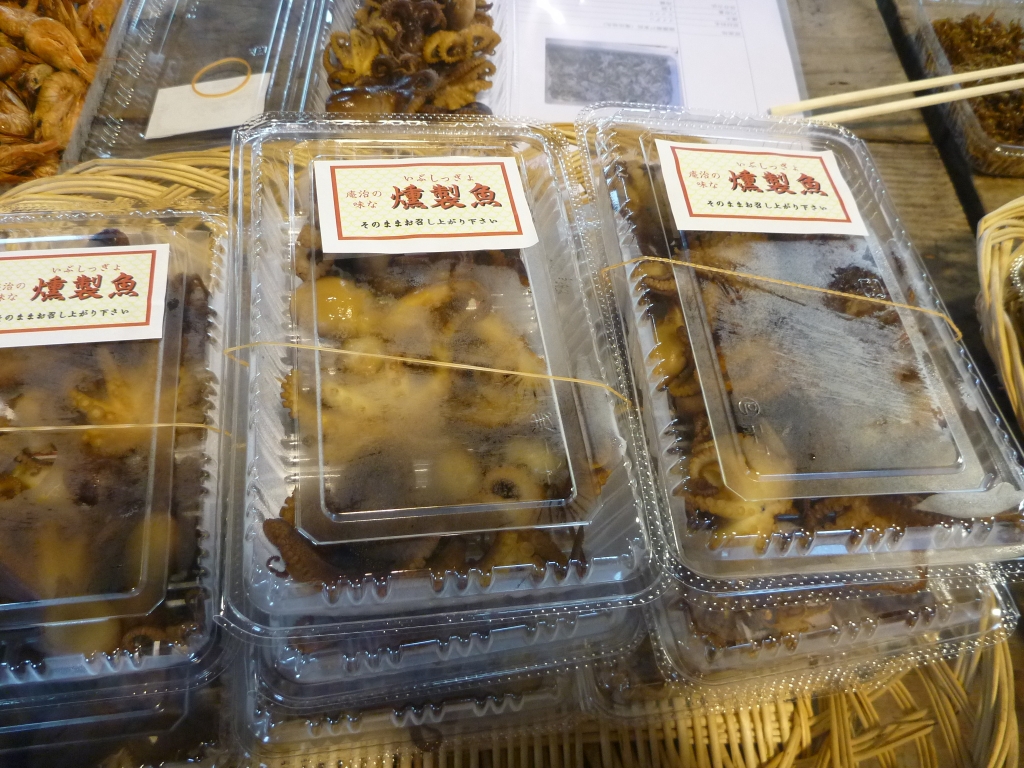 小エビ・イイダコ・ハマチ・ゲタ等燻製品、くぎ煮(女性部製品)です。