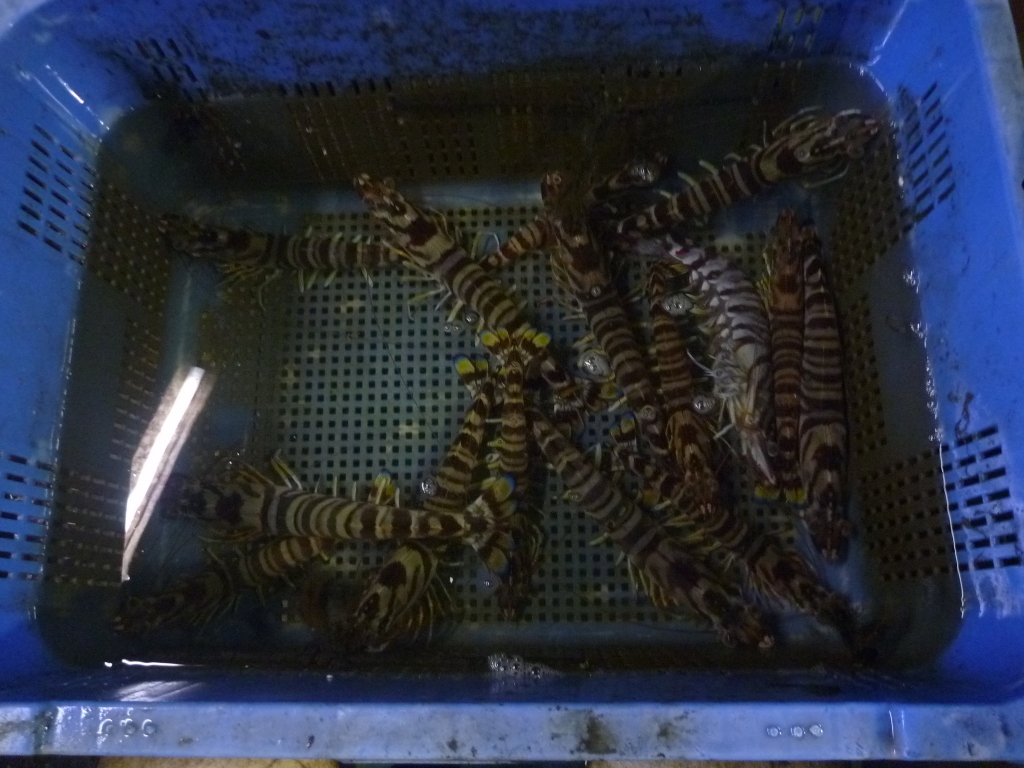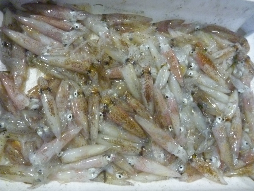 ベイカ、スルメイカ、小エビ、クルマエビ、ワタリガニ、ニシ貝等です。