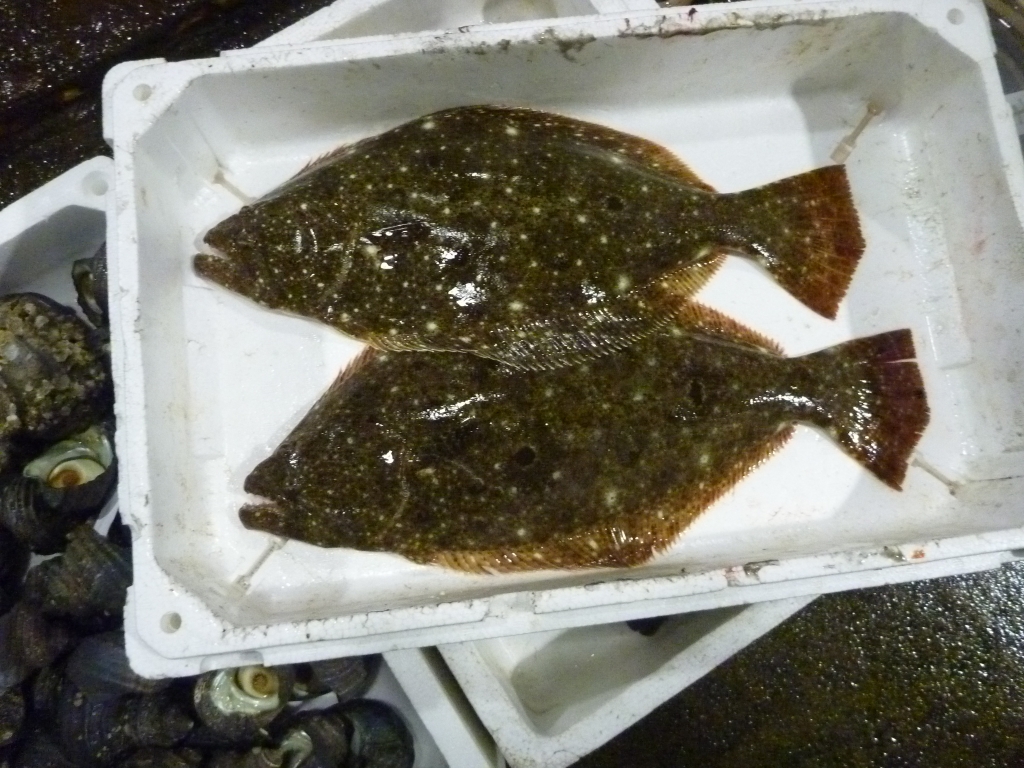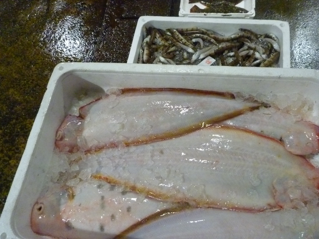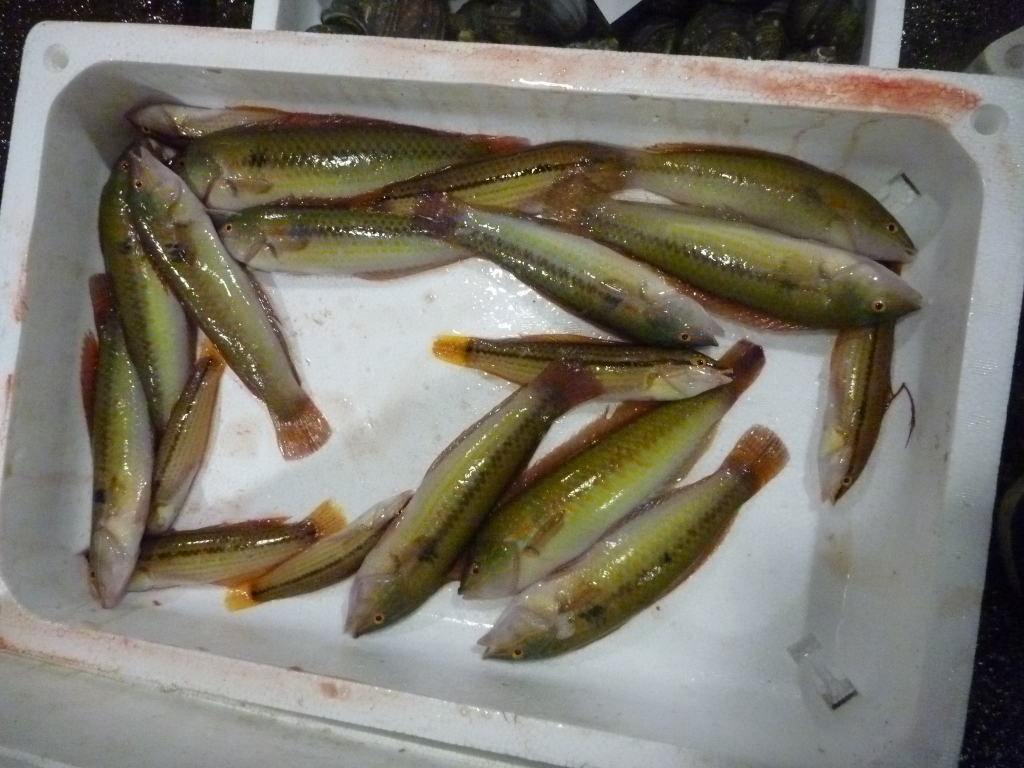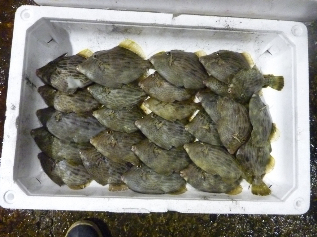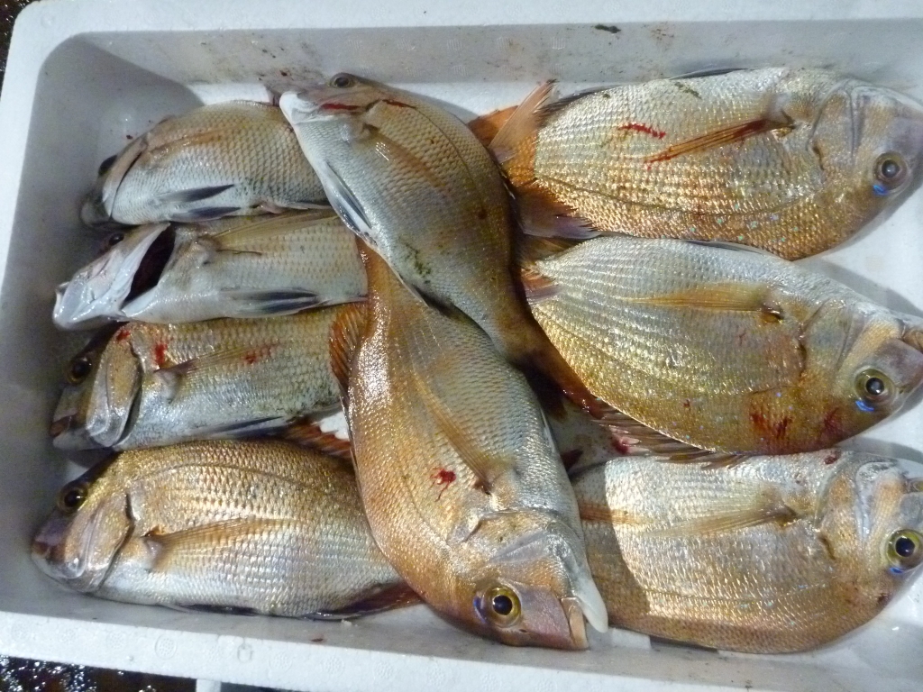 市場に出ている主な魚は、マダイ、チヌ、ヒラメ、ゲタ、メイタ、マルハギ、
